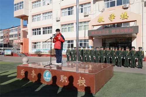 冬日初临,晨光清冽。12月1日清晨,在第十二个国家宪法日即将到来之际,乐亭职校全体师生齐聚操场,举行了以“做宪法卫士,筑法治根基”为主题的升旗仪式。这是一堂庄严的爱国主义教育课,更是一次深刻的法治精神洗礼,引导全体同学尊崇宪法、学习法律,争做新时代法治社会的坚定维护者和积极建设者。