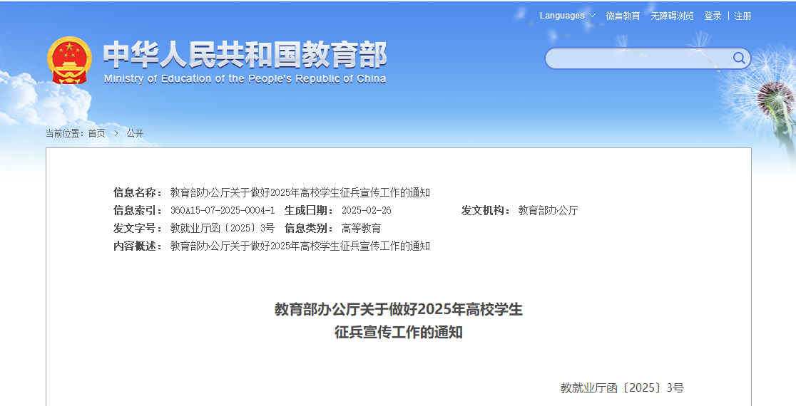 通知强调,高校学生是建设世界一流军队的重要人才资源。要把做好高校学生征兵宣传,作为服务国防和军队现代化建设的基础工程,落实立德树人根本任务的重要途径,拓宽青年学生成长成才通道的有效举措,引导青年学子自觉把个人理想融入强国强军伟业。全面把握宣传工作重点,突出政策激励宣传,讲好军旅成才故事,弘扬爱国主义精神。创新拓展宣传工作载体,构建全媒体传播矩阵,打造立体化宣传场景,广泛开展“征兵宣传进校园”活动,充分用好全国征兵网、高校官网、微信公众号、短视频平台等新媒体,营造浓厚宣传氛围。加强分类指导,针对不同学历层次和年级学生特点开展差异化宣传。注重宣传实效,畅通入伍“绿色通道”,鼓励引导更多青年学生特别是高校毕业生参军入伍,8月底前完成应届毕业生预定兵工作。
